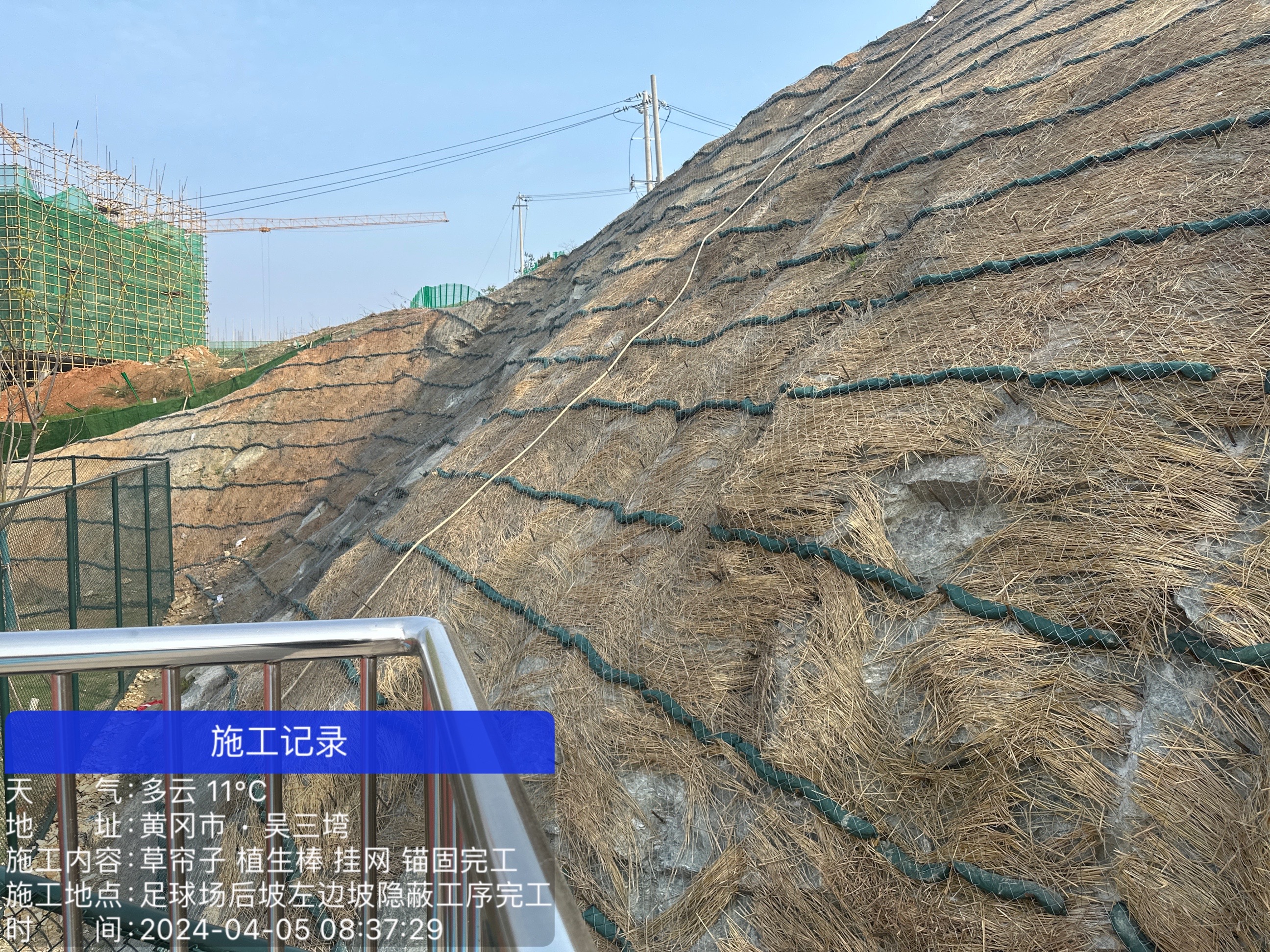武漢商貿職業(yè)學院紅安校區(qū)足球場邊坡綠化工程項目-隱蔽工序(鋪設草簾、安裝植生棒、掛鋼絲網、錨固)↓